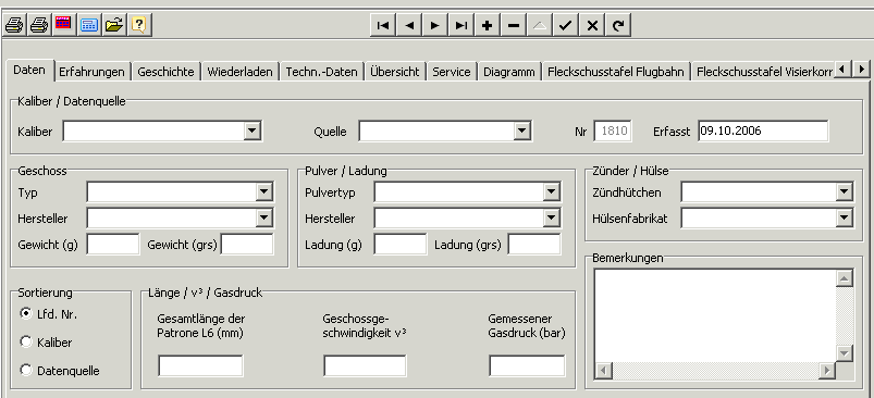 Dadurch werden alle Eingabefelder im Eingabeteil geleert, im Informationsteil wird an der Stelle, an der sich gerade der Cursor befindet, eine leere Zeile mit leeren Datenfeldern eingefügt. In der Spalte ID sehen Sie sofort, welche fortlaufende Nummer die neue Laborierung erhält. Diese Nummer wird intern vom Programm benötigt und kann von Ihnen nicht geändert werden.