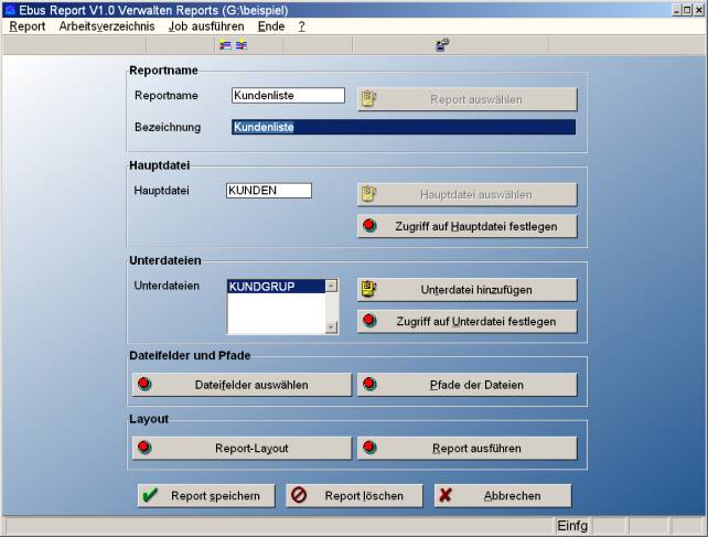Button 'Abbrechen': Ist das Feld Reportname das aktuelle Eingabefeld, so wird die Maske beendet, andernfalls wird die Bearbeitung des aktuellen Reports abgebrochen.